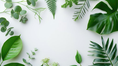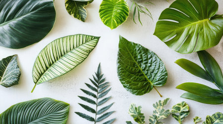 This image features a variety of green leaves and ferns artistically arranged on a plain background, highlighting natural beauty and organic designs.