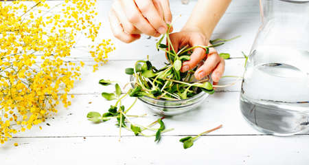 Microgreens growing background with raw sprouts in female hands. Fresh raw herbs from home garden or indoor vertical farm, full of vitamins for vegans. Banner
