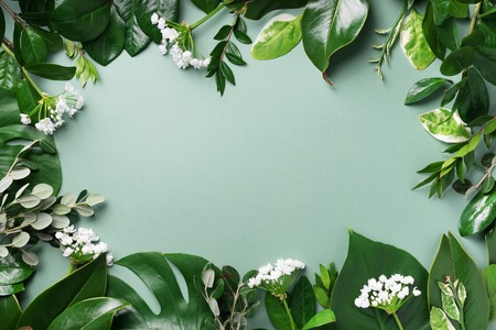 Green leaves on white background as botanical frame flatlay, eco design and spring nature flat lay