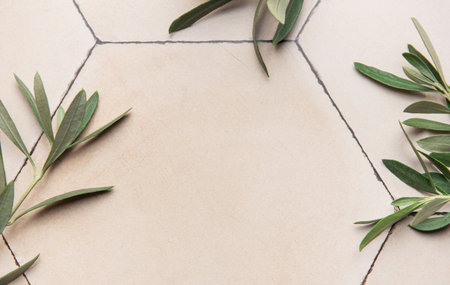 Olive branches elegantly frame hexagonal tiles, creating a rustic yet sophisticated background