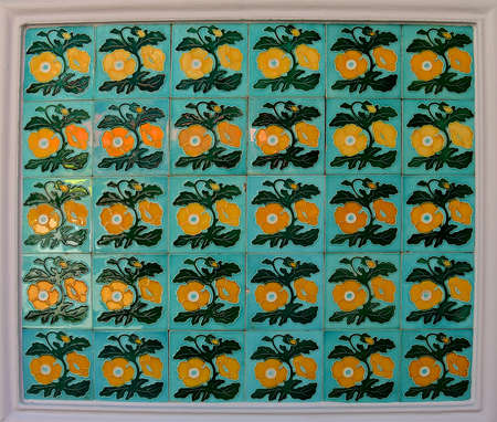A mosaic of blue tiles decorated with yellow flowers. These are typical of the tiles found on the facade of traditional Chinese Peranakan shop houses.