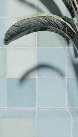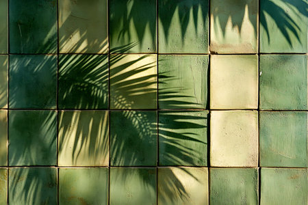 Green tile wall with shadow of palm tree leaves. Abstract background.