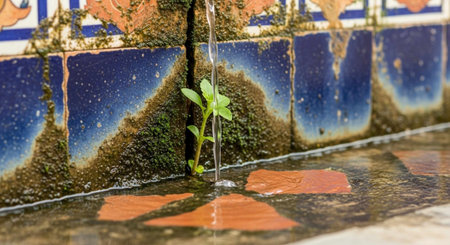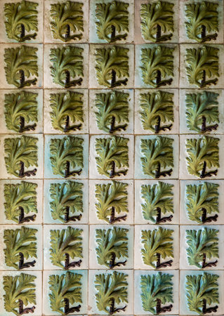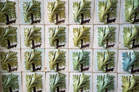 Sintra, Portugal - 21 August 2019: Rectangular pattern of ceramic wall tiles in Pena Palace with herbs and plants