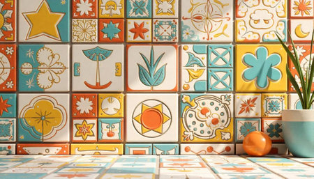 Brightly Colored Ceramic Tile Wall with Floral and Geometric Patterns