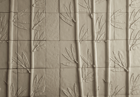 A mosaic of green tiles decorated with yellow flowers. These are typical of the tiles found on the facade of traditional Chinese Pernakan shop houses.
