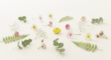 A flat lay image captures a collection of delicate spring flowers and green foliage scattered artfully across a clean white surface. The composition includes small pink blossoms and buds, tiny white flowers reminiscent of baby's breath, and a prominent yellow flower bud near the center. Interspersed among the blooms are fresh green elements, including rounded eucalyptus leaves and slender fern fronds. The arrangement evokes a sense of freshness, minimalism, and gentle beauty, suitable for use as a background or decorative element.