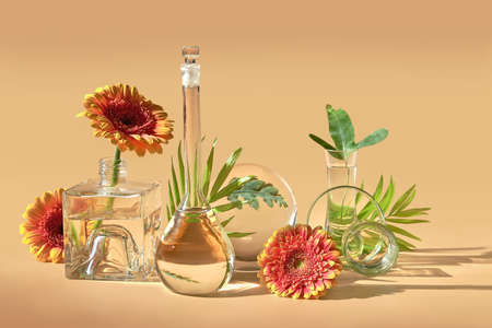 Flowers, transparent glass jars, bottles, vials. Reflections, distorted floral elements. Desaturated beige background. Natural sunlight, long shadows. Red gerbera, exotic leaves. Biophilia design.