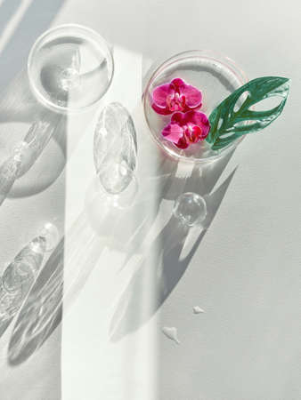 Monstera leaves, orchid flowers, petri dishes and glass balls. Direct natural sunlight with long shadows. Flat lay on off white background. Abstract glass decor, exotic vibrant magenta flowers.