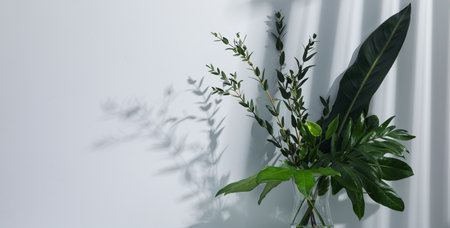 Soothing minimalist aesthetic with fresh green leaves and glassware casting delicate shadows under soft daylight, perfect for serene visual content. Generated A.I.