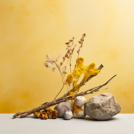 Creative wall background, product backdrop with plants, branches and textured stones, commercial template with copy space