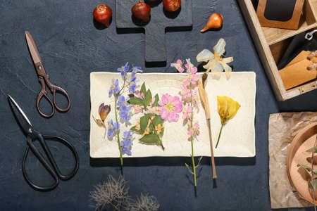 Workplace for hand crafting, hobbies or DIY. Natural materials, dried leaves, flowers in boxes on white table.