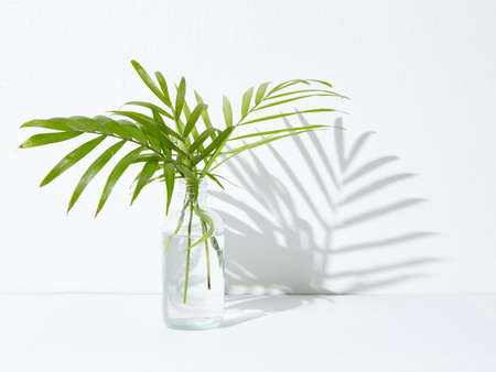 White orchid flower and palm leaves in vases on table top, front view composition with a space for a text