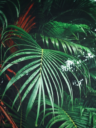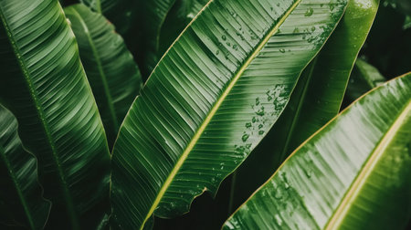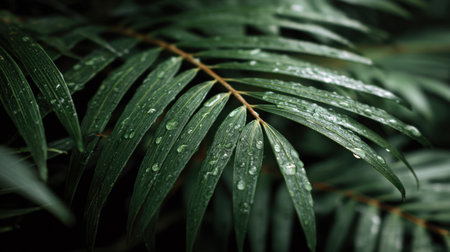 Close-up of rain-soaked palm leaves with dew drops, nature freshness concept