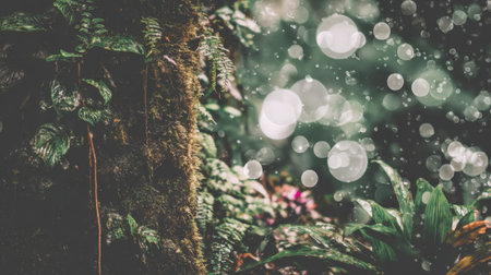 Close-up view of vibrant green fern fronds adorned with glistening water droplets in a humid tropical setting creating a serene natural atmosphere