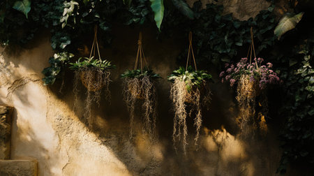 A serene display of hanging plants with visible roots against a rustic wall, illuminated by soft natural light, capturing the essence of indoor gardening.