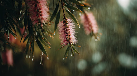 Soft rain falling gently on Bottlebrush, with water droplets forming and slowly dripping. The background is softly blurred with a natural, moody atmosphere.