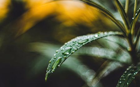 palm frond with raindrops from a tropical storm, close-up shot at extremely shallow depth of field