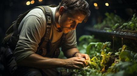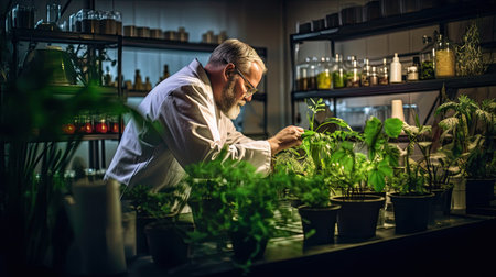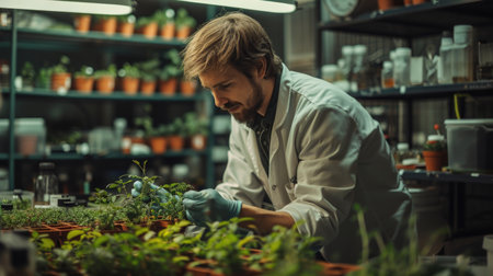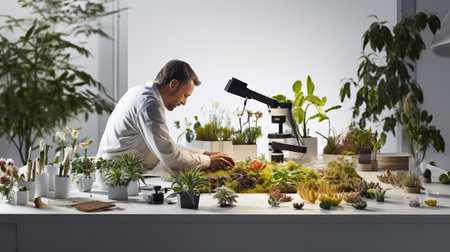 Experienced scientist working with plants. Serious young man in white lab coat examining plants while working in his laboratory, Biologist Working in a Professional Laboratory, AI Generated