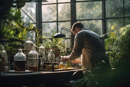 Agricultural scientist examining plant samples in a lab with chemical bottles around