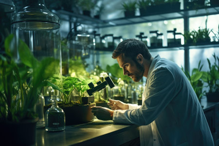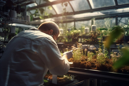illustration of a scientist conducting a sample microscopy in a greenhouse with Generative AI