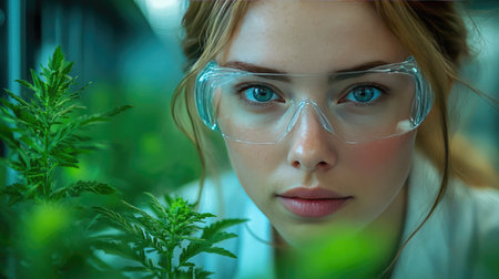 A female scientist wearing a lab coat and safety goggles, closely examining plants, symbolizing research in agriculture or botany.