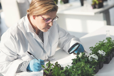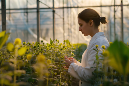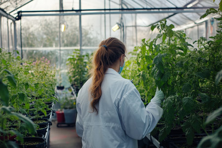 Generative AI, Female scientist is examining plants, biotechnological research of plants for agriculture