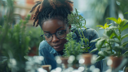 An African American woman tends to a plant in a vibrant, lush greenhouse.