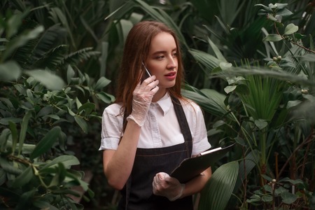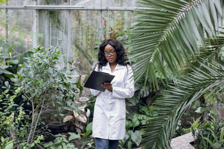 The picture of the botanist holding the book and pen inside the greenhouse has been surrounded with the green tree and plant, the botanist require skill like plant identification and knowledge. AIG43.