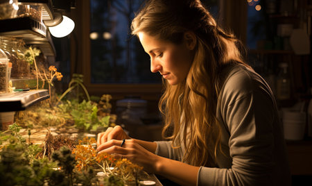 Garden botanist with rare orchid magnifying glass precision and research focus
