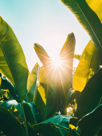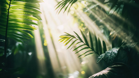 Sunlight filters through vibrant green leaves, illuminating the tropical forest and creating a tranquil atmosphere filled with nature's beauty.