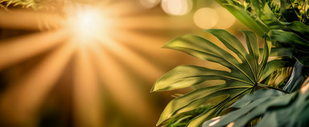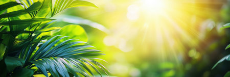 Tropical jungle background. Green leaves in sunlight with lens flare.
