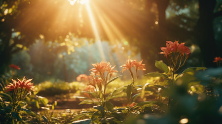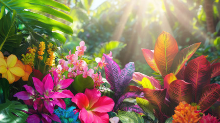 A stunning display of vibrant tropical flowers and lush greenery, beautifully illuminated by sunlight, creating an enchanting and serene atmosphere.