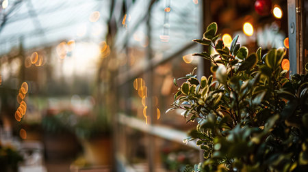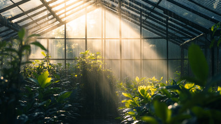 A captivating scene featuring soft sunlight streaming through a greenhouse, illuminating lush green plants, creating an atmosphere of tranquility and serenity.