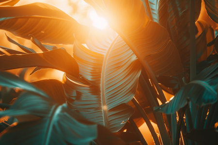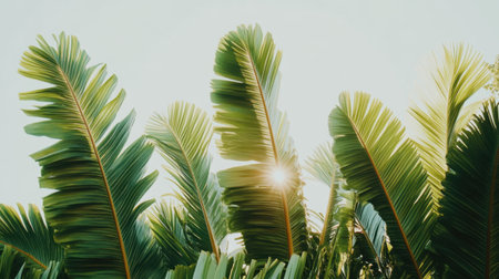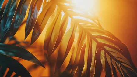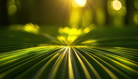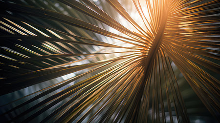 Immerse yourself in a vibrant abstract tropical scene featuring dense palm leaves forming geometric patterns Sunlight filters through, creating a mesmerizing botanical display This intricate design, ideal for backgrounds and artistic projects, captures nature's artistry and celebrates tropical aesthetics Explore stunning visuals for your creative needs AI Generative