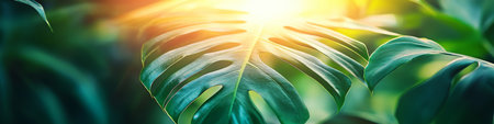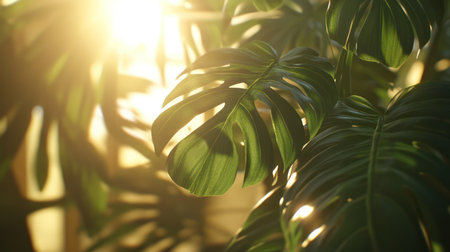 Vibrant Monstera leaves hang gracefully, bathed in soft sunlight filtering through the canopy of a tropical rainforest, creating a serene atmosphere. Generative AI.