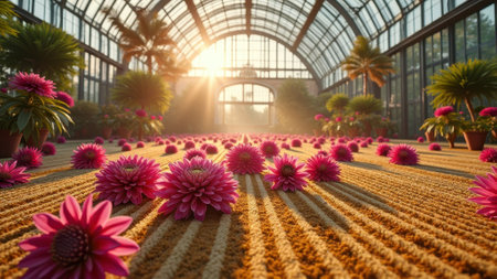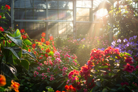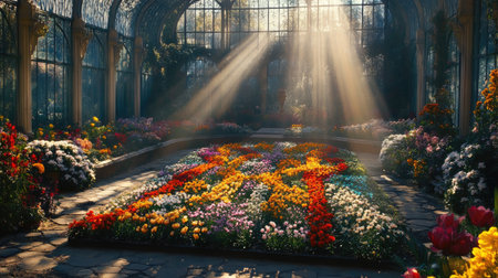 A stunning interior of a greenhouse filled with vibrant flowers under soft sunlight. The colorful display creates a serene and artistic atmosphere.