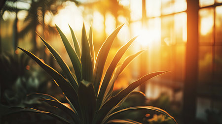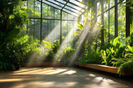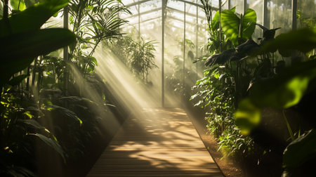 Sun rays filtering through the glass roof of the greenhouse, illuminating tropical plants, creating a serene atmosphere
