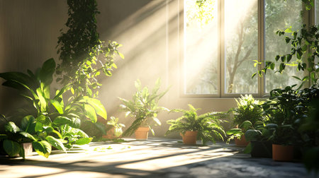 Indoor garden showcasing diverse green plants in pots, bathed in warm sunlight filtering through windows, enhancing the peaceful and calming environment, AI generated
