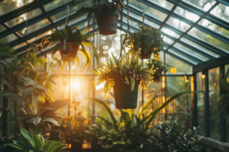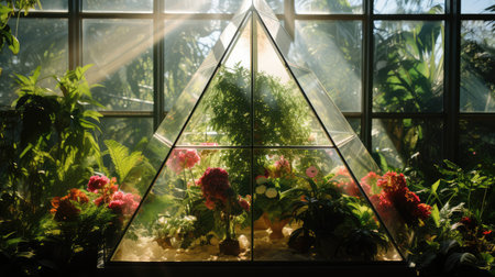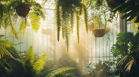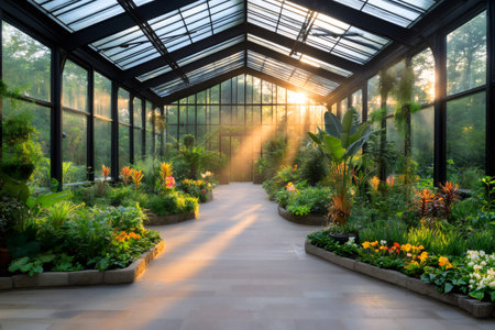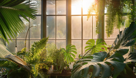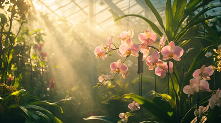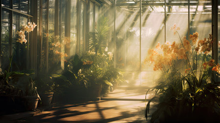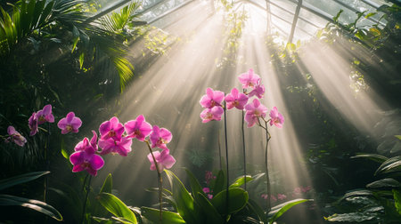Sunlit paradise in a glasshouse: a vibrant botanical garden filled with exotic plants and orchids