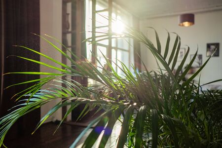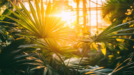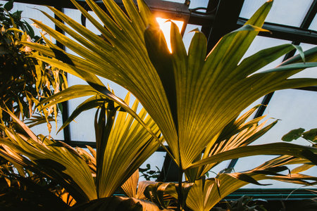 Rays of sun through palm leaves in tropical greenhouse soft focus. Plant in glasshouse. Urban jungle