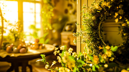 Blur background of natural light shine though window in spring season with tree and flower plant in the room. Elegant home decor and peaceful indoor gardening concept. Design for wallpaper.