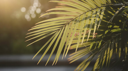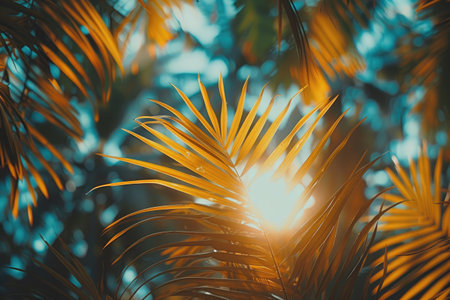 Close up of palm tree leaf with sunbeams and lens flare effect