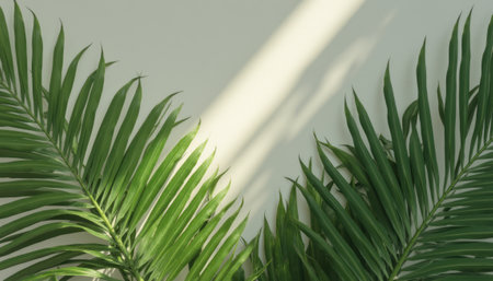 Sunlight streams through vibrant green palm leaves, casting soft shadows on a pale wall in a welcoming indoor area during mid-morning.