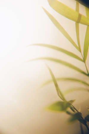 Green branches of a decorative palm tree with a shadow on a yellow background. Natural background. Selective focus