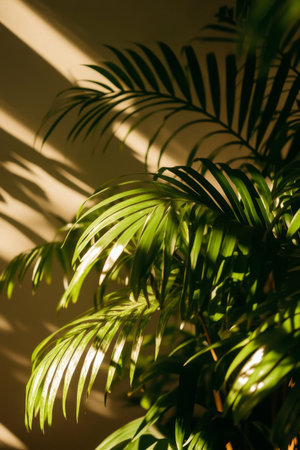 Sunlight filters through, creating patterns on lush palm leaves in a serene indoor environment. The rich greens contrast beautifully with the subtle background.