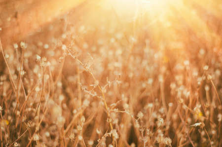 Closeup of grass and leafs with beautiful orange evening sunset. Lensflare and warm colors