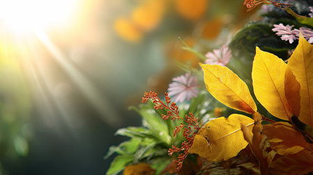 A breathtaking view of vibrant greenery and colorful leaves glowing under gentle sunlight, showcasing the beauty of nature in a serene environment.