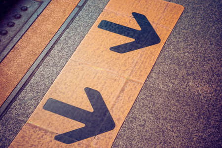 Yellow arrow symbol or sign on platform in the queue waiting for the skytrain. Sign for passenger train that is ridden primarily by commuters. Bangkok, Thailand.