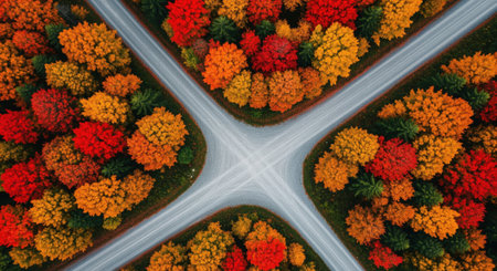 Symmetrical aerial view of a road intersection surrounded by vibrant red, orange, and yellow autumn trees. nature beauty, seasonal change, and travel path.