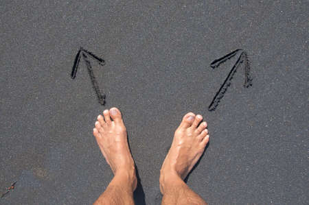 Man's feet standing in front of two arrows drawn on a black sand beach that are leading in two different ways